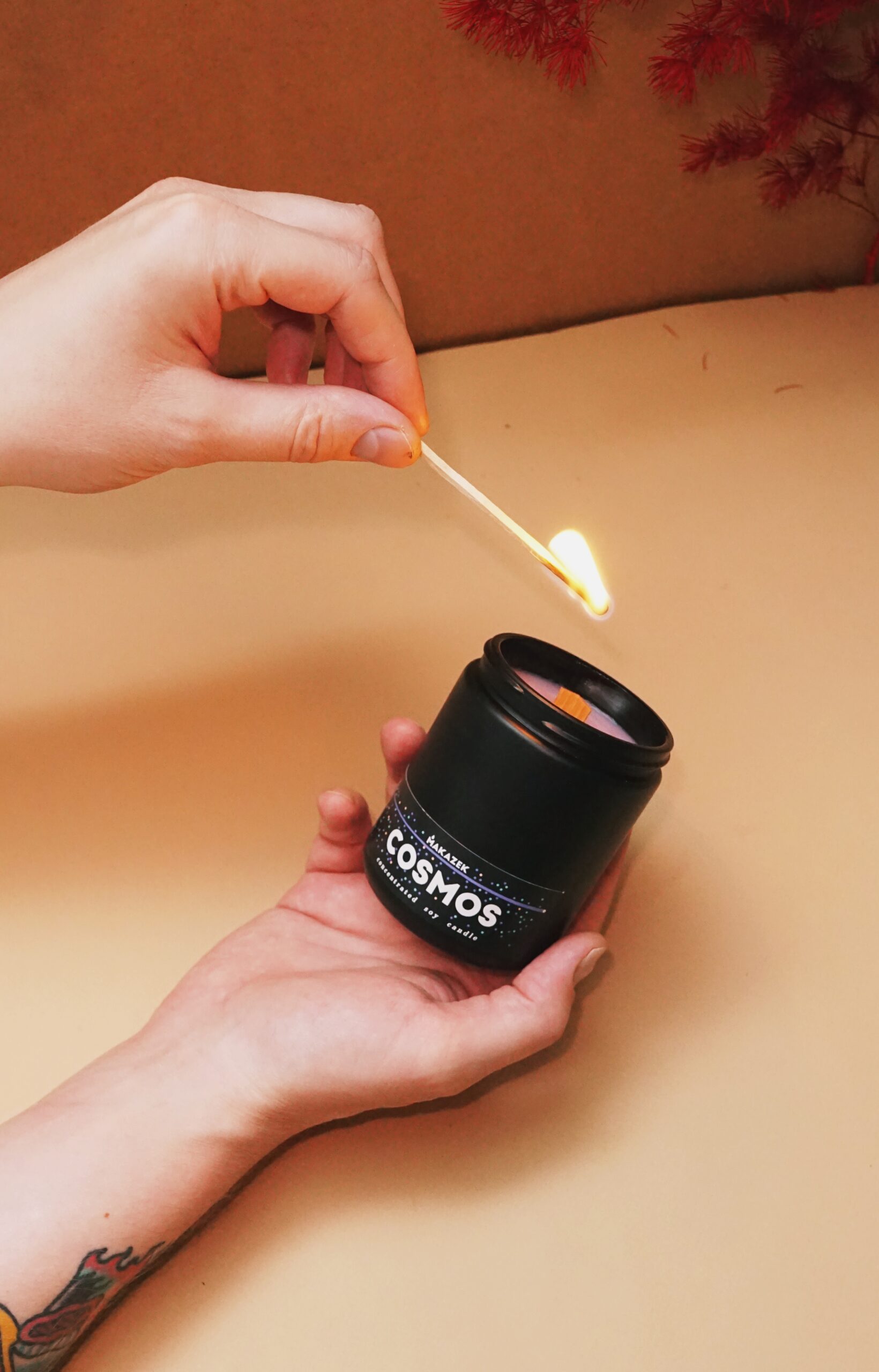 Dom bez świec nie ma duszy, dlatego dzielnie staram się dbać o to, by duszy nie brakowało – zajmując każdą powierzchnię płaską świecami. Gdy KOSMOS trafił w moje ręce, kątem oka widziałam, że mój domownik resztką sił stara się utrzymać opanowanie i spokój. Nie zważając na jego reakcje, odkręciłam słoik i zadziała się magia – poczułam zapach świeżego prania (a jestem nieco stuknięta na punkcie świeżości), intensywny zapach czystości i porządku. Idealny dla osób, które lubią intensywne zapachy, które nie są jednocześnie ciężkie. Po odpaleniu widziałam, że spięcie na twarzy lubego maleje i chórem uznaliśmy, że to jeden z najlepszych zapachów, na jakie trafiliśmy. I ktokolwiek zajmował się nazewnictwem – trafił w punkt.