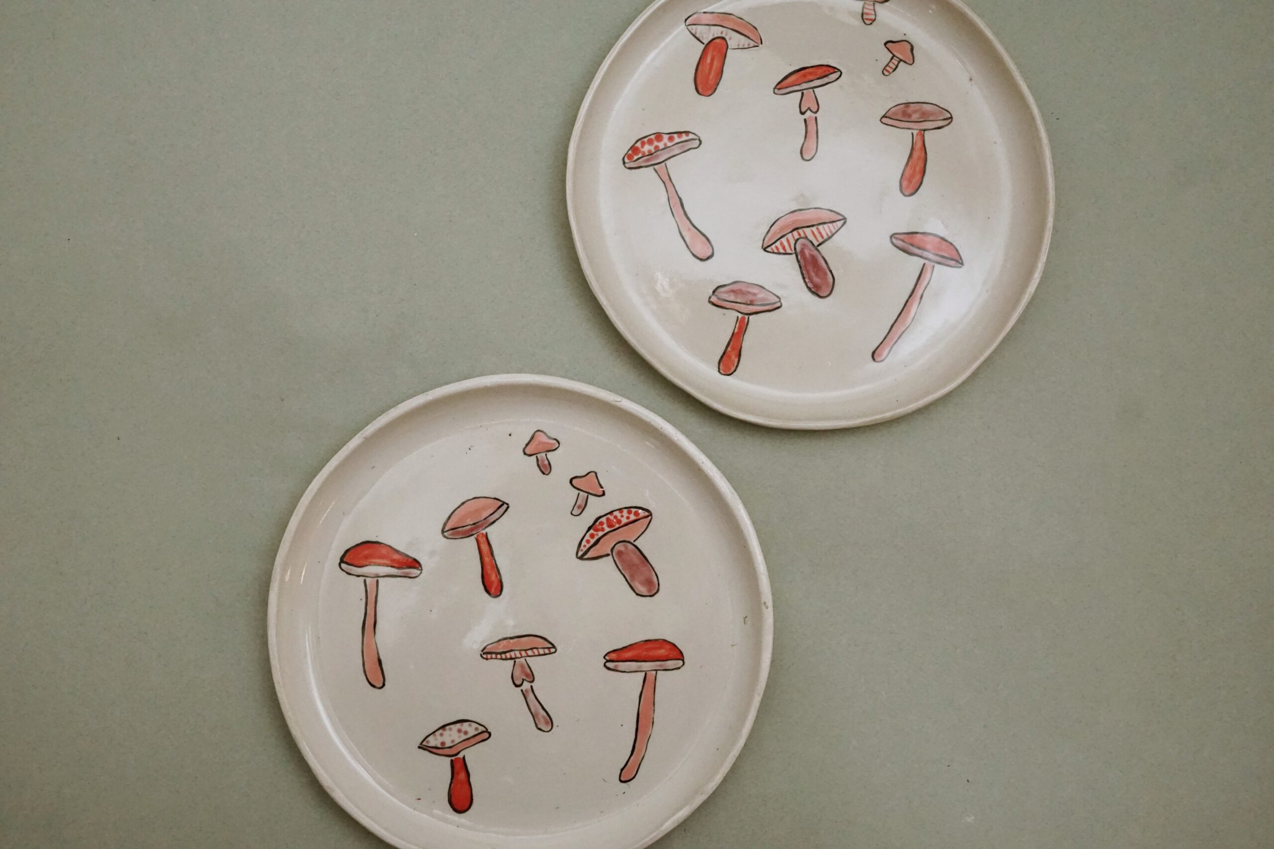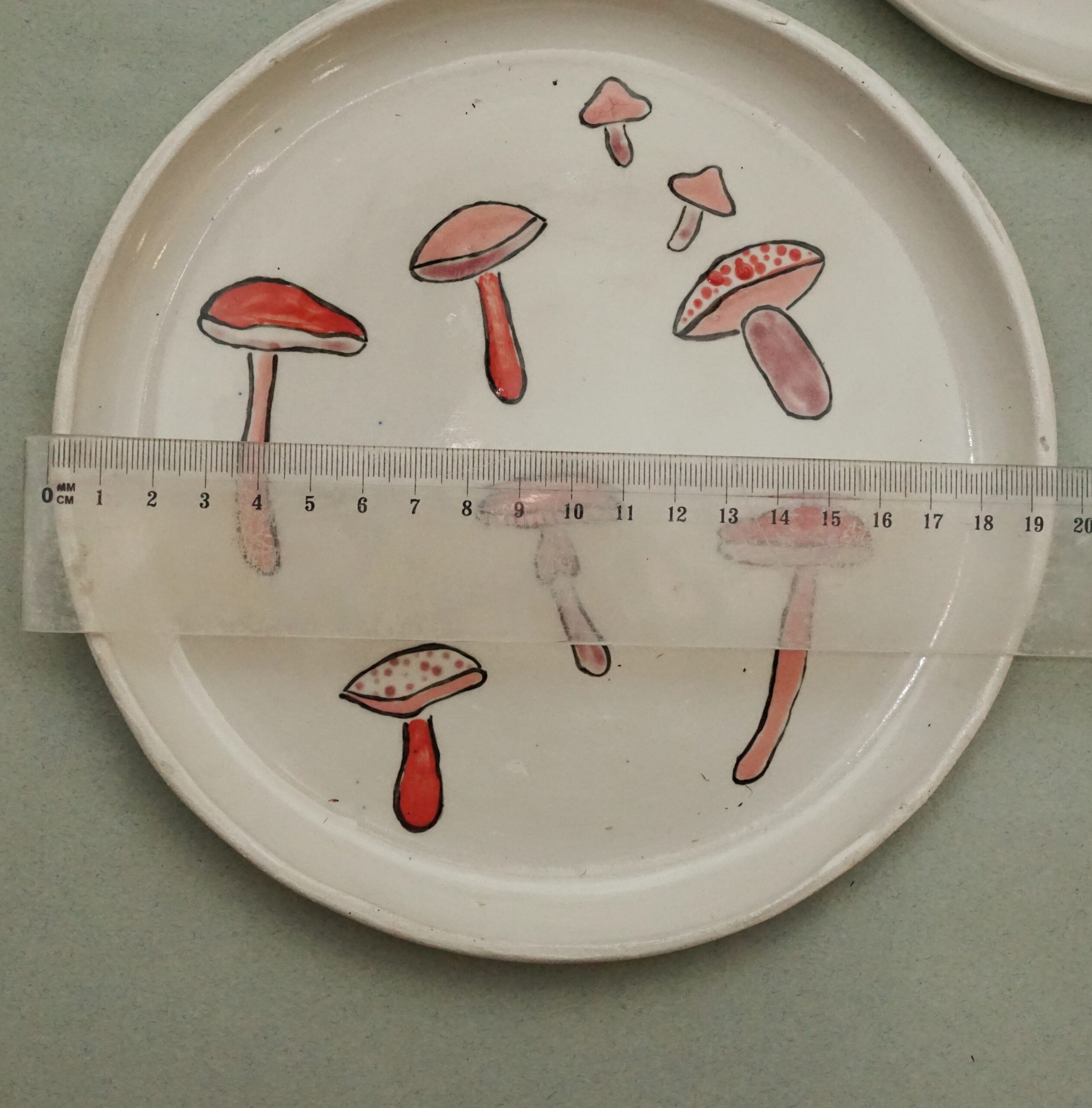 Malowane ręcznie 2 talerze w grzyby. Średnica 19,5 cm